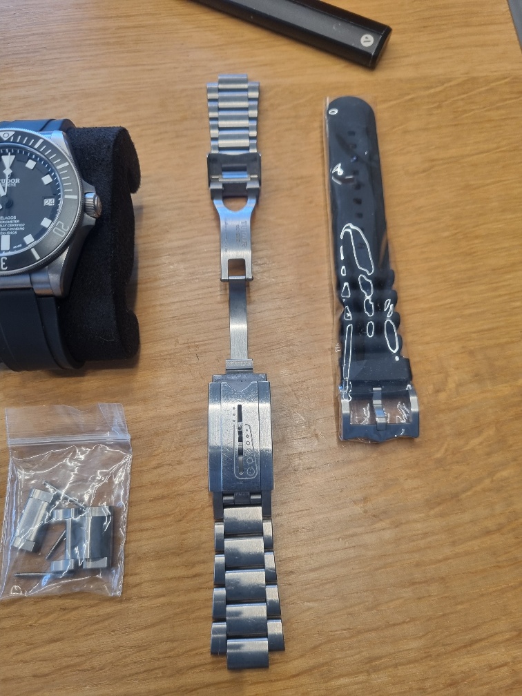 Livrée avec: Boîte et sur-boîte, papiers, 2 bracelets noir en caoutchouc vulcanisé + un bracelet en titane avec boucle déployante.